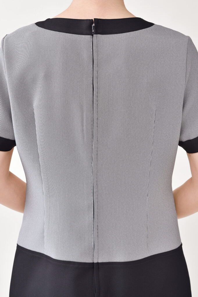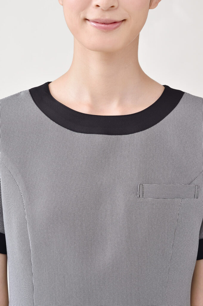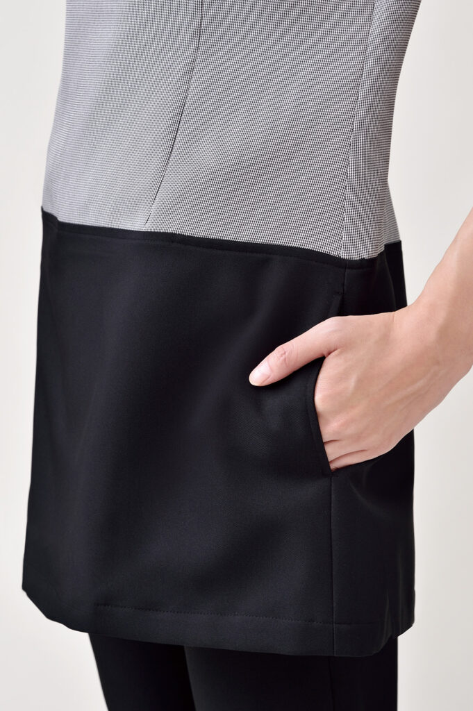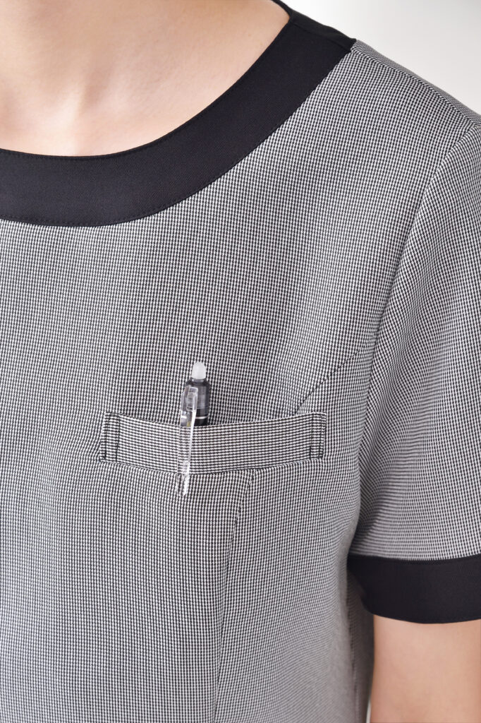 無地ライクな千鳥柄に、黒配色で大人っぽく仕上げた絶品デザインのチュニック。細かめの千鳥柄が品良く、好感度抜群の“映える”デザインです。胸・両脇ポケット付きで使いやすさも◎。