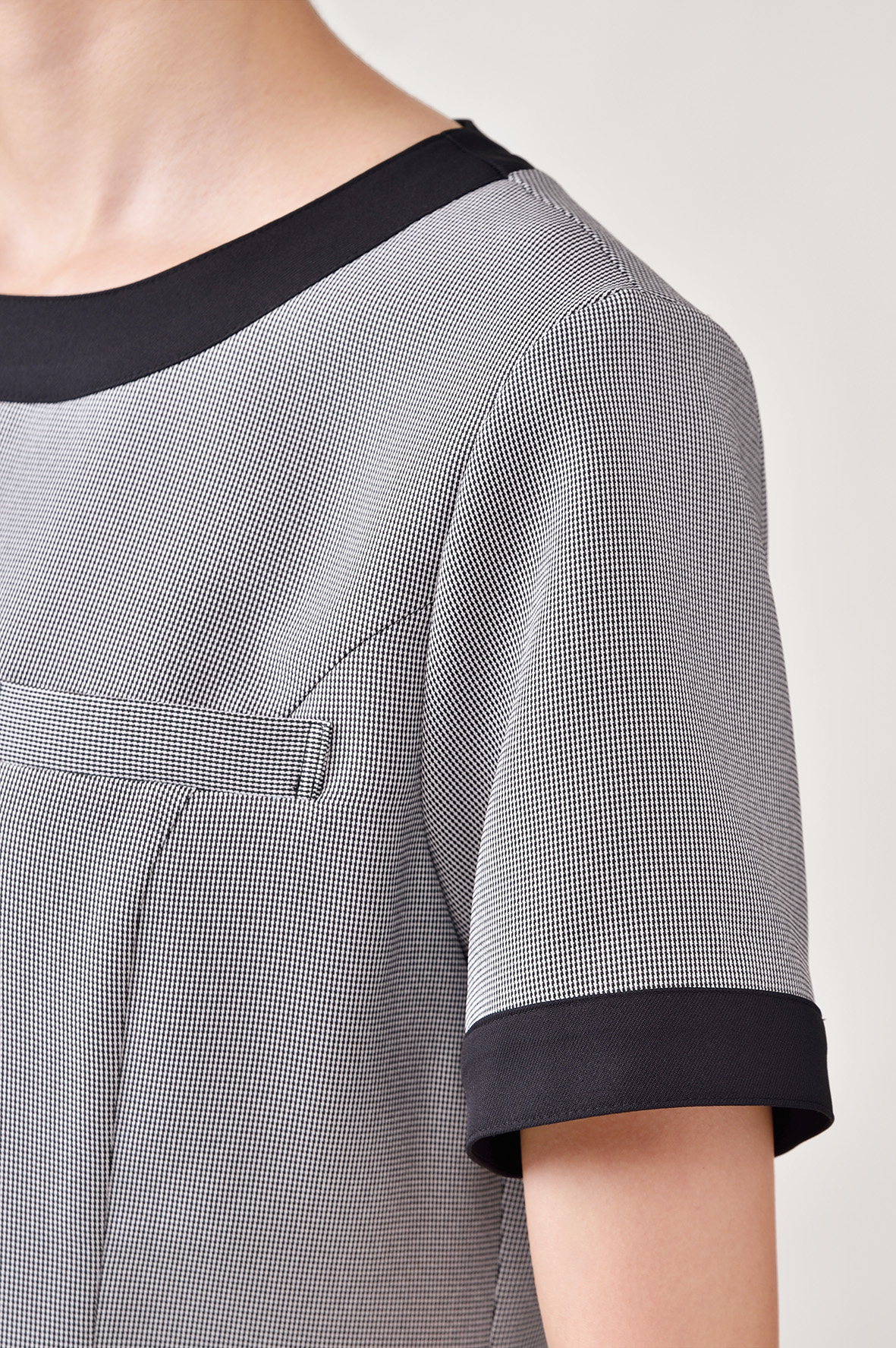 無地ライクな千鳥柄に、黒配色で大人っぽく仕上げた絶品デザインのチュニック。細かめの千鳥柄が品良く、好感度抜群の“映える”デザインです。胸・両脇ポケット付きで使いやすさも◎。