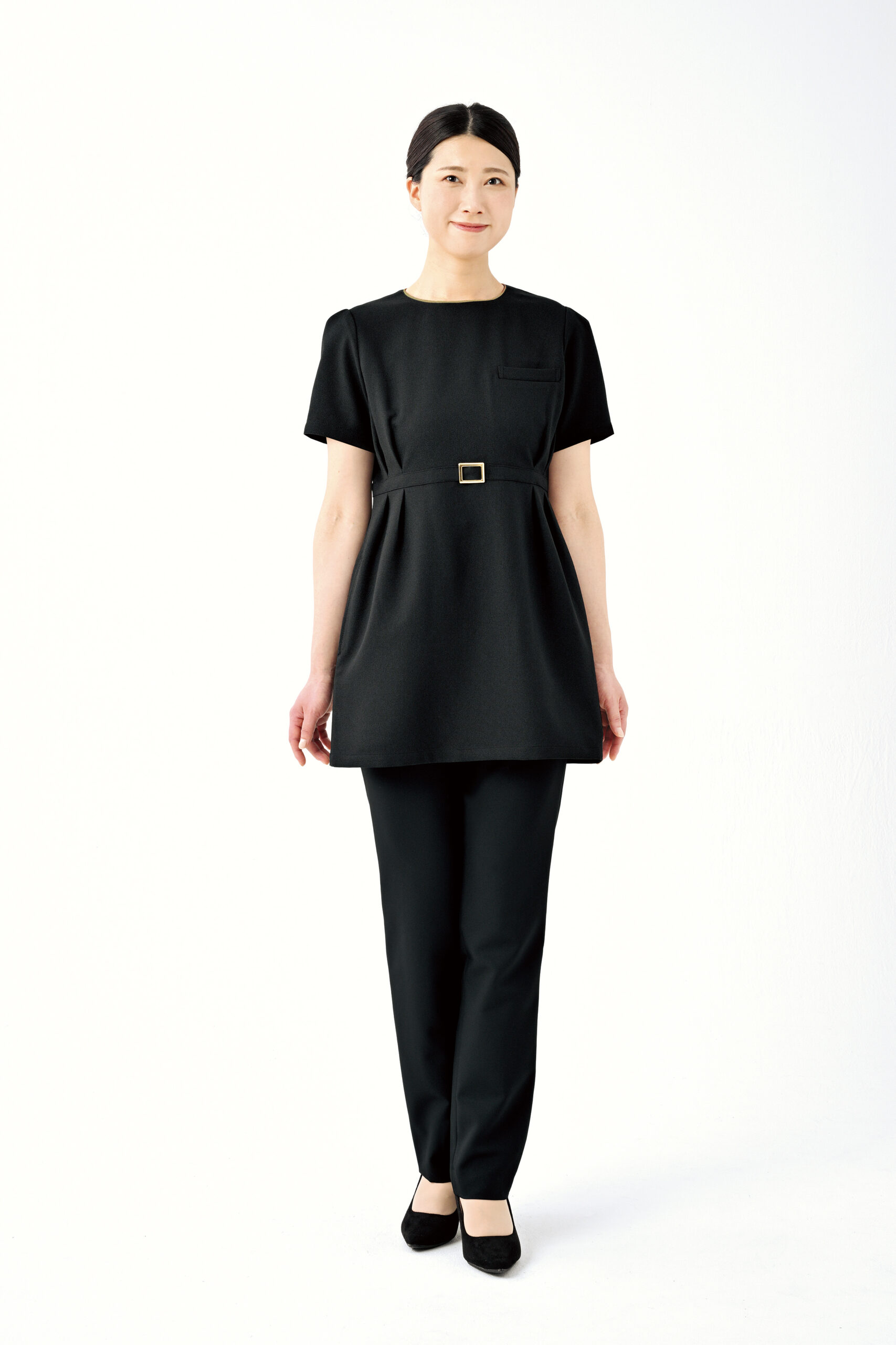 全身バランスがすっきり見える絶品チュニック。パンツを合わせた時に絶妙なシルエットになるように追求した黄金バランス。パイピングやバックルのゴールドを効かせたエレガントなデザインが上品な印象です。